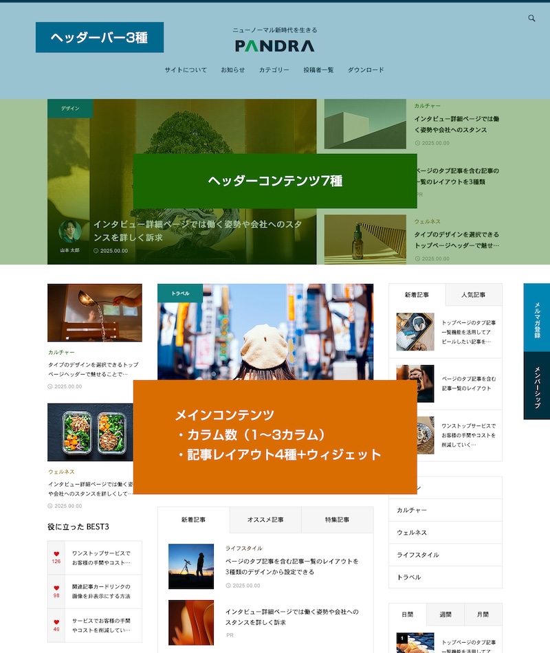 By freely combining these parts, a single theme can produce countless styles. It’s a theme that truly responds to users’ desire to “create a site like this.”